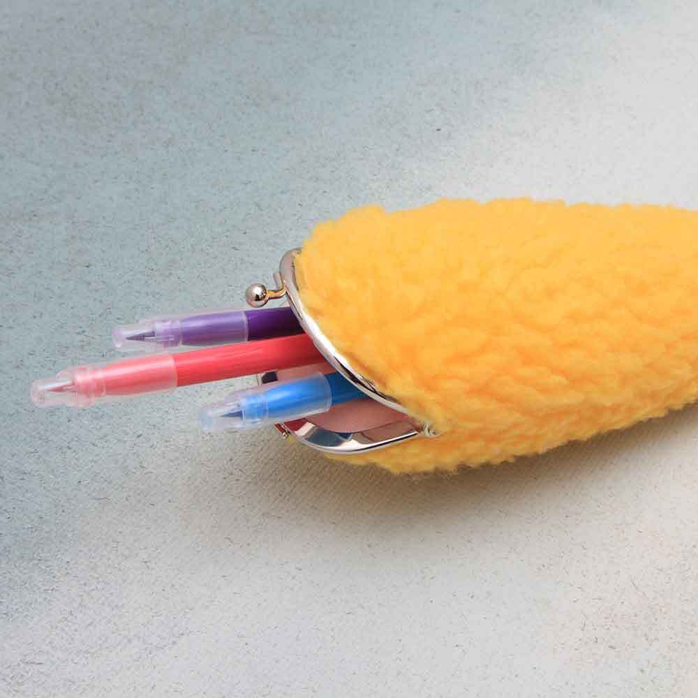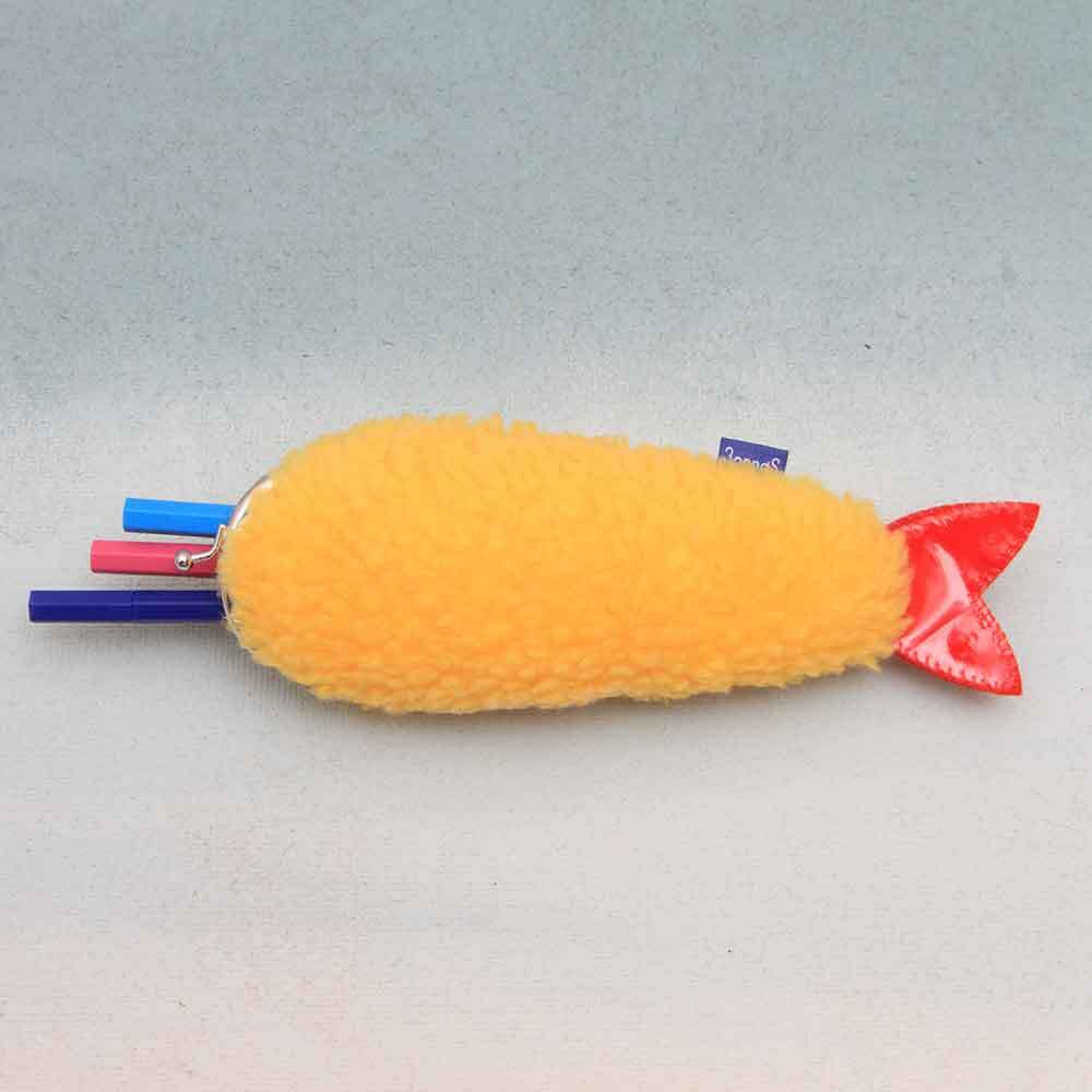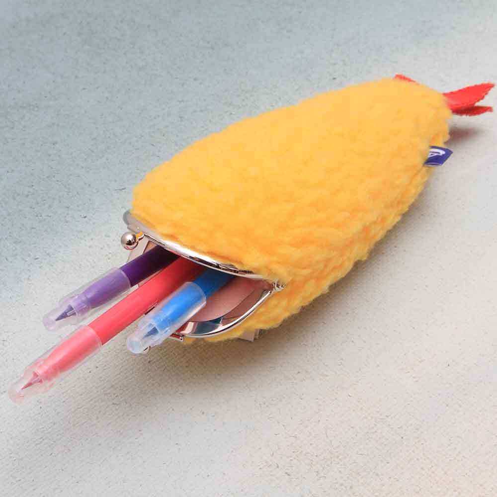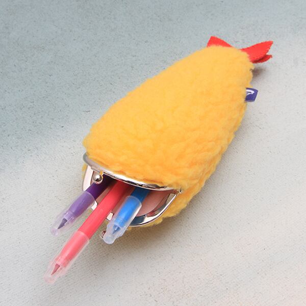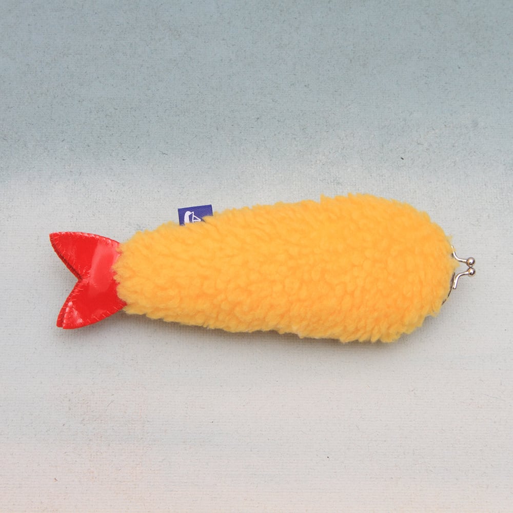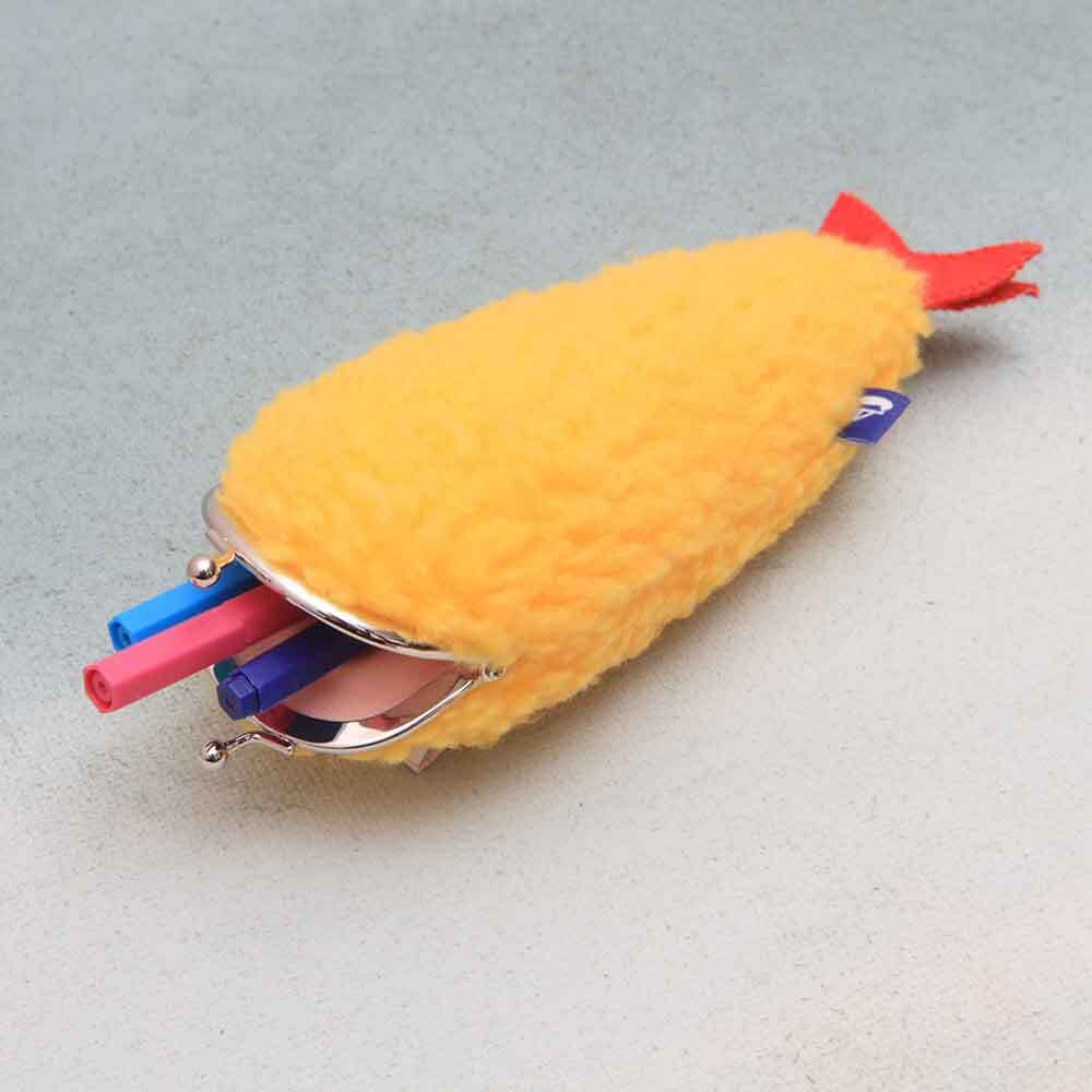 黄色いファーの衣と真っ赤なエナメルのしっぽ。エビフライ型のペンケースです。素材を新たに改良してバージョンアップ。少し太ってリッチなエビフライに仕上げました。デスクの上での存在感もアップ! 色も鮮やかな黄色の衣になりました。